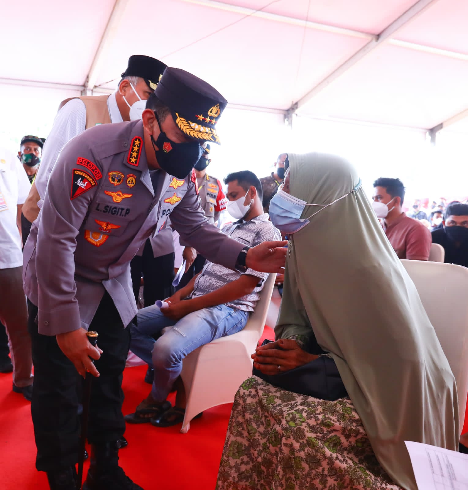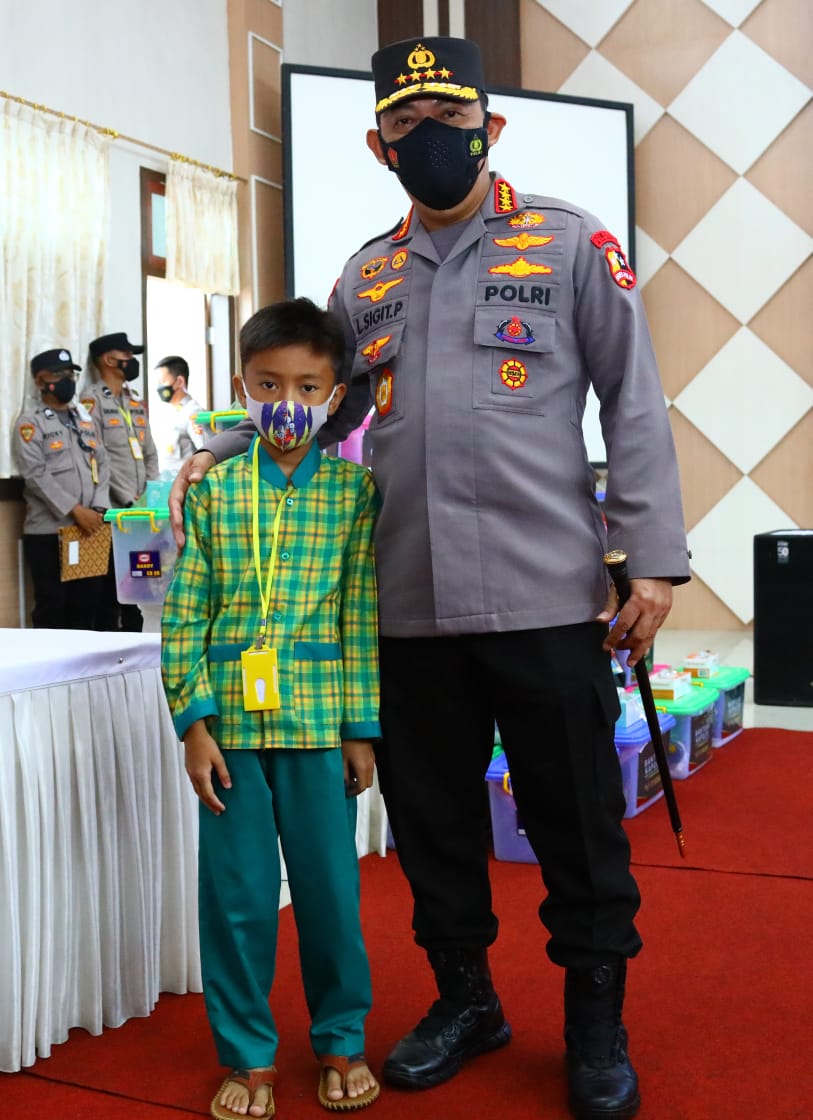 Setelah itu, Kapolri memasuki Aula Kantor LPMP langsung menyerahkan bantuan secara simbolis kepada masyarakat dan siswa yang melakukan vaksin, terang Kabid Humas.