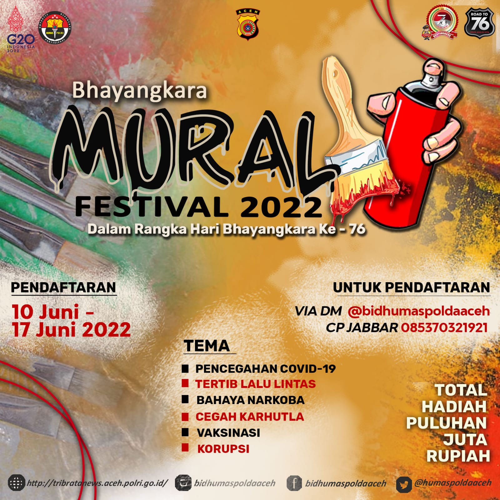 Lanjut Inspektur Jenderal Polisi Drs Ahmad Haydar Dalam lomba mural kali ini, kata Ahmad Haydar, pihaknya menentukan beberapa tema, yaitu TERTIB LALU LINTAS, CEGAH KARHUTLA, BAHAYA NARKOBA, VAKSINASI, CEGAH COVID-19, DAN KORUPSI.