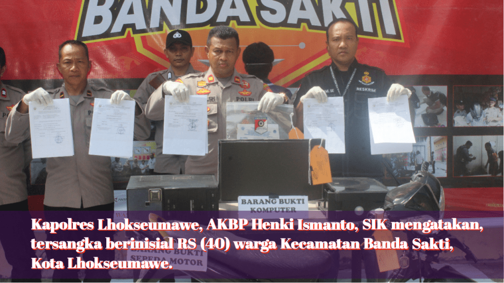 Kapolres Lhokseumawe, AKBP Henki Ismanto, SIK mengatakan, tersangka berinisial RS (40) warga Kecamatan Banda Sakti, Kota Lhokseumawe. Selain itu, sejumlah barang bukti juga ikut diamankan yakni, satu set perangkat komputer yang digunakan tersangka untuk membuat surat setoran retribusi daerah palsu, 23 lembar surat setoran retribusi daerah palsu, satu unit sepeda motor dan satu lembar surat setoran retribusi daerah palsu asli sebagai pembanding.